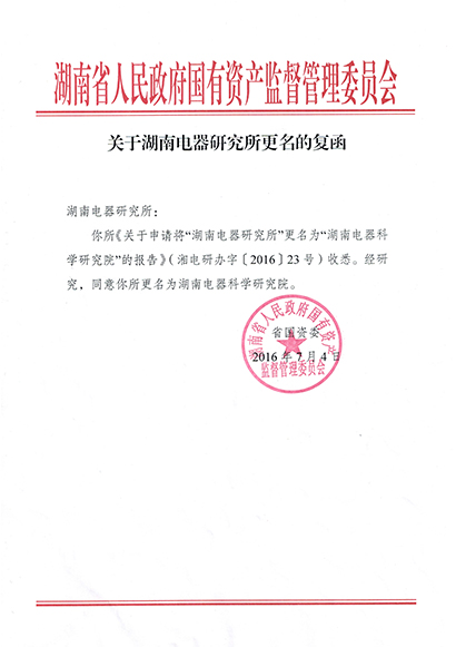 湖南電器研究所經(jīng)國資委批復(fù)于2016年12月1日更名為湖南電器科學(xué)研究院。